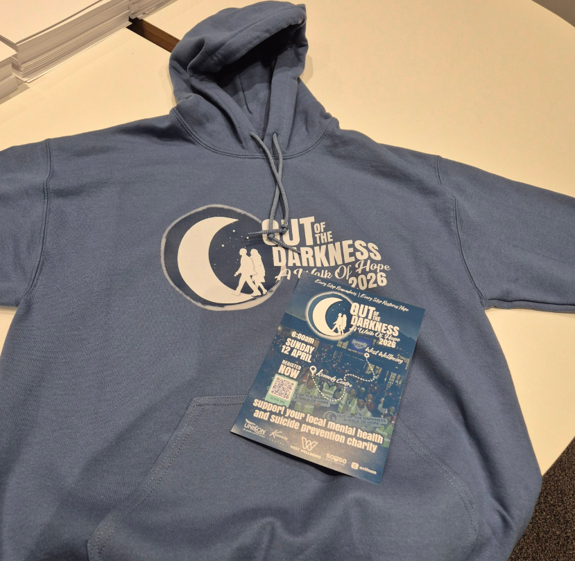 This Out of the Darkness hoodie proudly displays the event logo on the front, symbolising hope, compassion, and community strength. All proceeds from each purchase go directly towards supporting mental health and suicide prevention services, helping West Wellbeing continue its work supporting people through crisis, recovery, and connection.